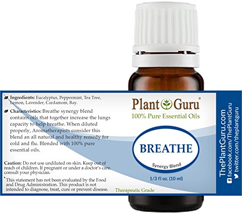 Studio : Plant Guru Publisher : Plant Guru Binding : Health and Beauty Product Description Name: Breathe Synergy Blend * Contains: Eucalyptus (Eucalyptus Globulus), Peppermint (Mentha Piperita), Tea Tree (Melaleuca alternifolia), Lemon (Citrus limonum), Lavender (Lavandula angustifolia), Cardamom (Elettaria cardamomum), Bay (Laurus nobilis)* Characteristics: This essential oil synergy blend contains oils that together increase the lungs capacity to help breathe. It works well in a nebulizing diffuser at the office. Usage: This synergy blend contains 100% pure essential oils. We recommend a 3 to 5% dilution for topical body applications. * Cautions: It is possible that this blend may cause sensitivities; users are recommended to use these blends only in dilution and not as a replacement for traditional medicine. For external use only. 0