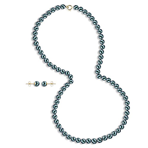 It's a Beautiful 14k Yellow Gold 5-5.5mm Black Round Akoya Cultured Pearl Necklace 18" Length, With a Matching Stud Earrings Jewelry Set. The Necklace is Single-knotted and Secured with a Spring-ring Clasp.