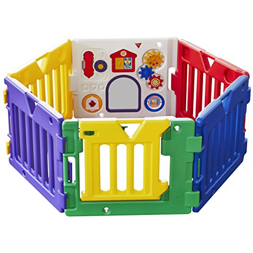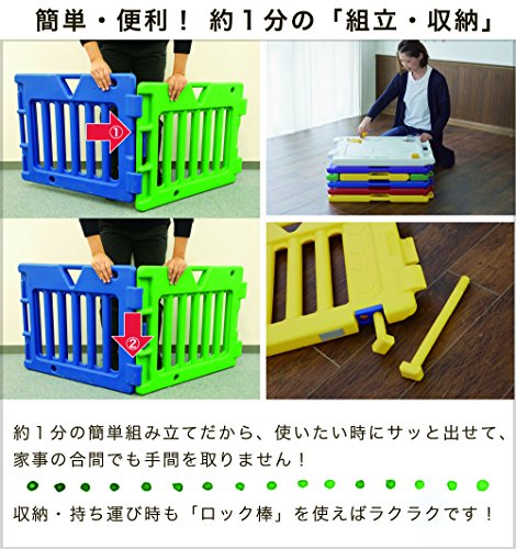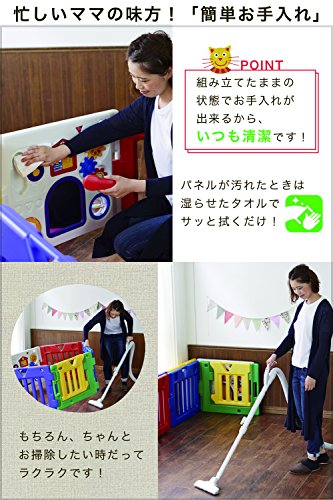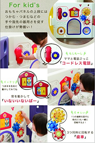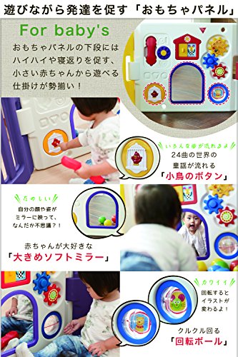 閉塞感もなく、楽しく遊びながら赤ちゃんの独創的な知性を育みます。たたみ約一畳弱の広いスペースで、全24曲の電子メロディ、クルクル廻る透明ボール、コードレス電話、かくれんぼ窓など、さまざまな仕掛けを内蔵し、楽しい遊びがいっぱい! 「別売」のスマートマットや拡張パネルの追加でアレンジ可能です。