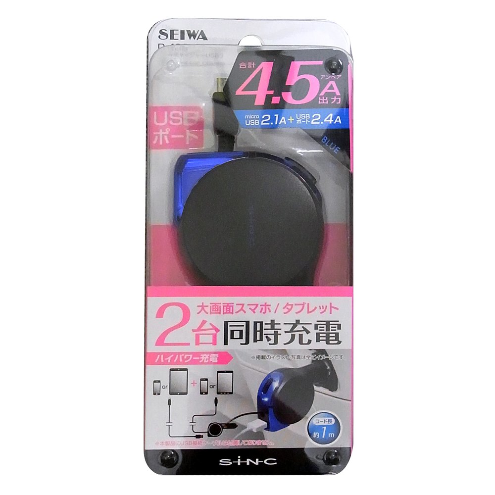 Seiwa charger reel charger USB3 microUSB 2.1 + 2.4A 12-24V Black Metal Blue D409