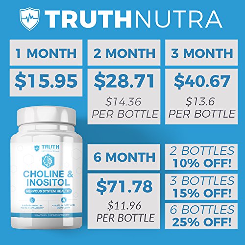 -. Binding : Health and Beauty -. Brand : Truth Nutracueticals -. EAN : 0724696095118 -. Feature : Supports Healthy Nerve Transmission / Brain Health / Assists in Fatty Acid Metabolism in the Liver -. IsAdultProduct : 0 -. Label : Truth Nutracueticals -. LegalDisclaimer : These statements have not been evaluated by the Food and Drug Administration. These products are not intended to diagnose, treat, cure or prevent any disease. Product results may vary from person to person. -. Manufacturer : Truth Nutracueticals -. MPN : 724696095118 -. PackageQuantity : 1 -. PartNumber : 724696095118 -. ProductGroup : Health and Beauty -. ProductTypeName : HEALTH_PERSONAL_CARE -. Publisher : Truth Nutracueticals -. Size : 100 Capsules -. Studio : Truth Nutracueticals -. Title : CHOLINE & INOSITOL: Nervous System Health -. UPC : 724696095118