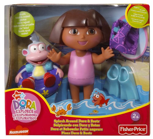 Feature : Make a splash with Dora and the Twins / Dora's arms and head move, and she twists at the waist / Dora is dressed in her bathing suit and flippers / Twins are ready with their floating inner tube, too! / Girls will have fun in the tub with the new Splash Around Dora and Twins!