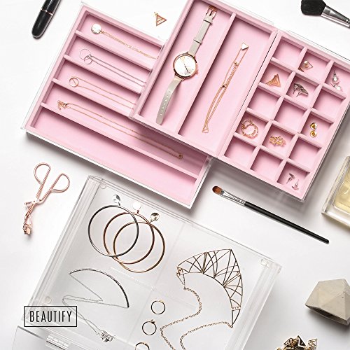 -. Title : Beautify Acrylic Jewelry & Cosmetic Organizer Box with 3 Storage Trays & Gray Suede Dividers - Clear