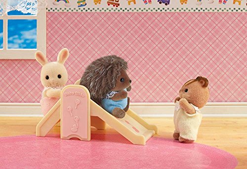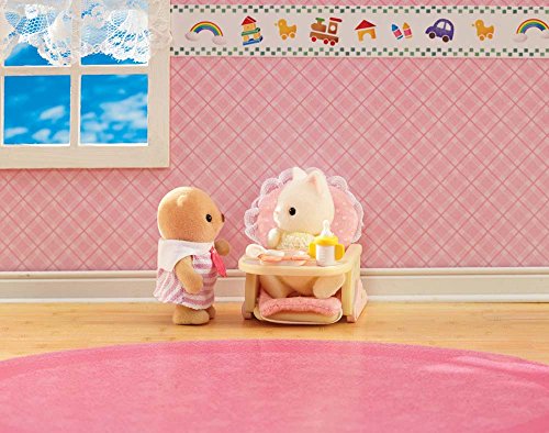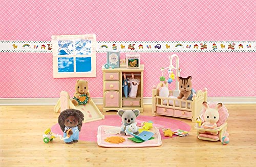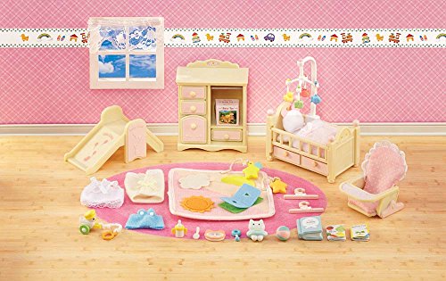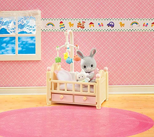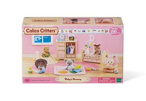 -. Feature : Fun and educational / Performance and quality tested / Great fun for children of all ages / Includes dresser with 4 drawers and hanging rod, crib with 2 drawers and removable rail, slide, baby seat, and baby mat with toys. / Also includes over 15 accessories like outfits, toys, cushions, blankets, and more! / Will fit any Calico Critter baby or twin / Collect them all! / Hours of creative, imaginative play time!