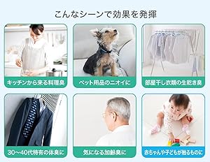 「プラズマクラスターパワフルショット」 後ろルーバーを閉じて前方向に集中的に高濃度プラズマクラスターイオンを集中的に放出する「プラズマクラスターパワフルショット」運転を搭載。 通常運転ではお部屋の空気をキレイにし、パワフルショットではソファーやカーペットなどに向けて、付着する "ニオイ" や菌を消臭・除菌します。 |