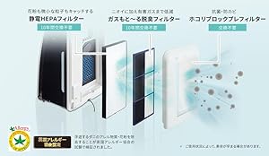 ニオイやホコリをキャッチする3つのフィルター 交換不要のホコリブロックプレフィルターのほか、ニオイや有毒ガスも低減(※)する「ガスもと~る脱臭フィルター」、かふんひゃ微小な粒子もキャッチし目詰まりしにくい「静電HEPAフィルター」で、空気をキレイに。 ※ シャープ調べ。1m³試験容器内でのVOC(ホルムアルデヒド、トルエン、酢酸エチル)、NOx、SOxでの効果であり、実使用空間での実証結果ではありません。 |