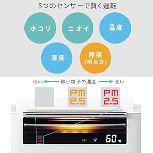 高感度センサー・PM2.5モニター搭載 従来品より感度をアップしたホコリセンサー、明るさ、ニオイ、湿度、温度の5つのセンサーで賢く運転します。花粉などの大きな粒子に加え、0.5µmの微小な粒子まで検知。 PM2.5などの微小な粒子の濃度(目安)※を当社独自のアルゴリズムで判別し、わかりやすく色でお知らせ。濃度が高い時は、風量を強めて集じんします。 ※環境省大気汚染物質広域監視システム(そらまめ君)と当センサーの測定結果をもとにシャープ独自のアルゴリズムでPM2.5相当の濃度を判別しています。PM2.5モニターはあくまでも目安です。 |