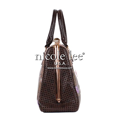 Exterior features: made of faux leather, Nicole Lee's Muneca print on front and back, studs embellishments, circular laser cut design on the sides, gold-tone hardware, dual top handles, back zip pocket, 2 sliding zip closure and Nicole Lee nameplate in front.