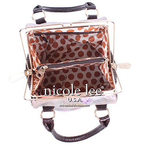 Carry this season's must have the Nicole Lee Muneca Print Frame Bag. Exterior features: made of faux leather, Nicole Lee's Muneca print on front and back, studs embellishments, circular laser cut design on the sides, gold-tone hardware, dual top handles, back zip pocket, 2 sliding zip closure and Nicole Lee nameplate in front. Interior features: zip wall pocket with NL nameplate at interior back, double open wall pockets at interior front, middle center zip pocket with 9 open wall pockets and polka dots print with NL logo satin lining. Faux leather handles with 5.5 inch drop. Color available is Sunny, Dolly, Tina, Lucia. For cleaning, wipe with damp cloth.Feature