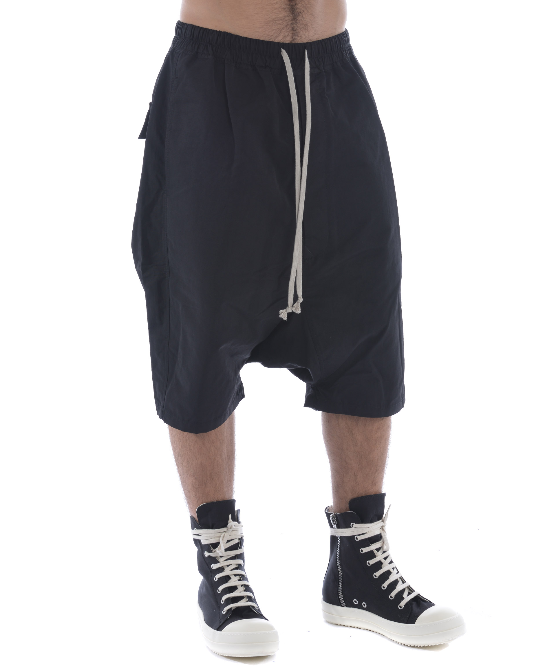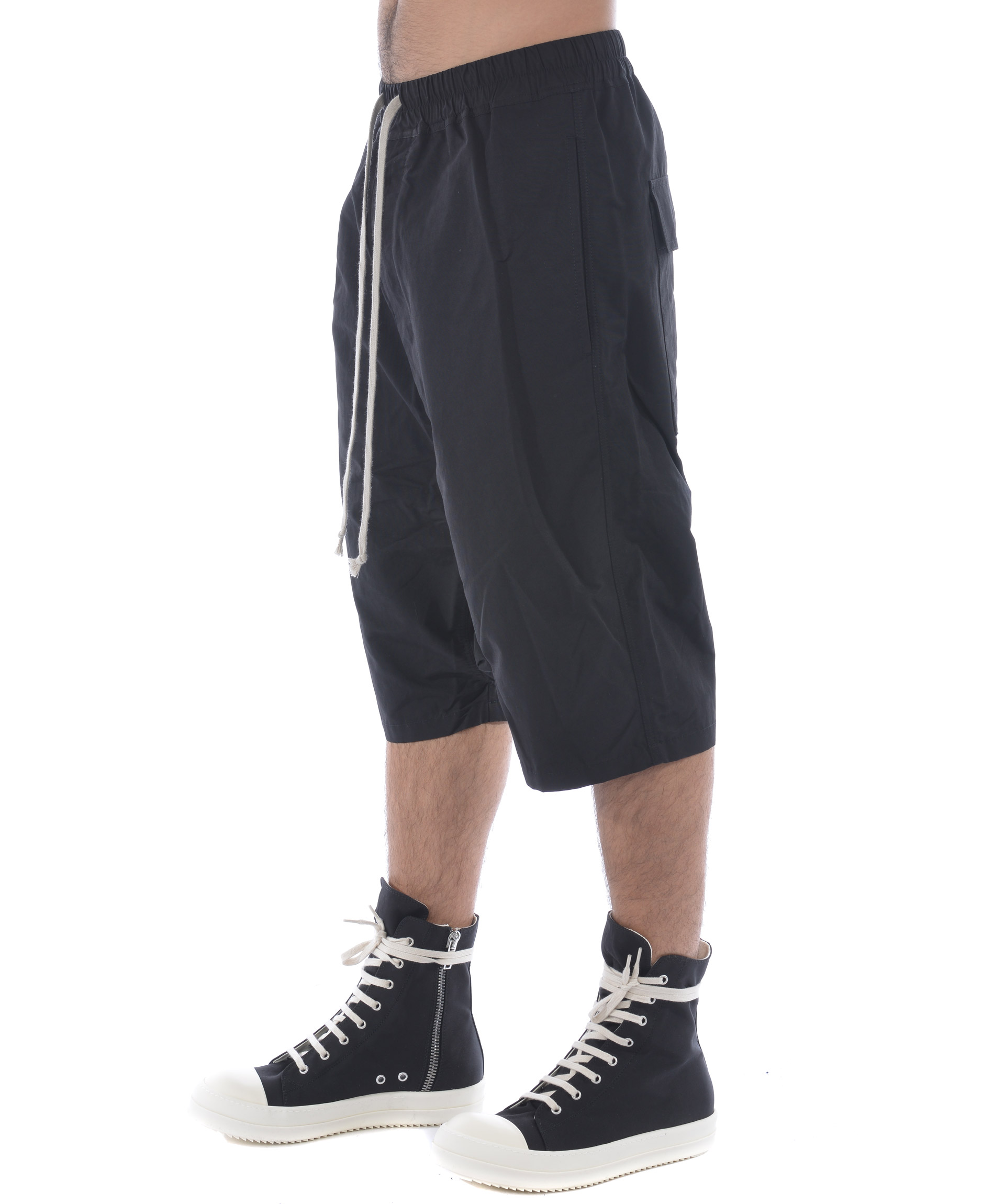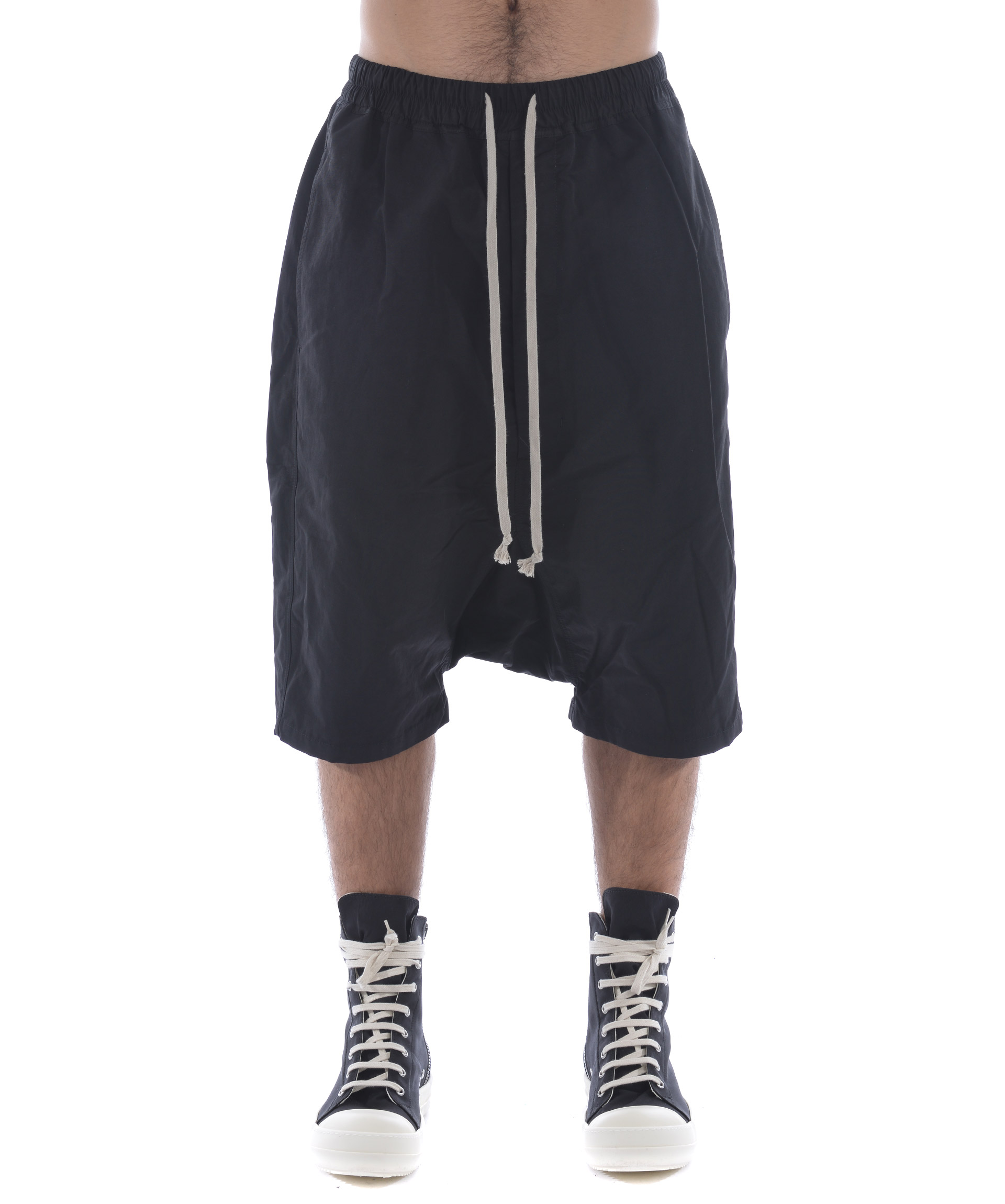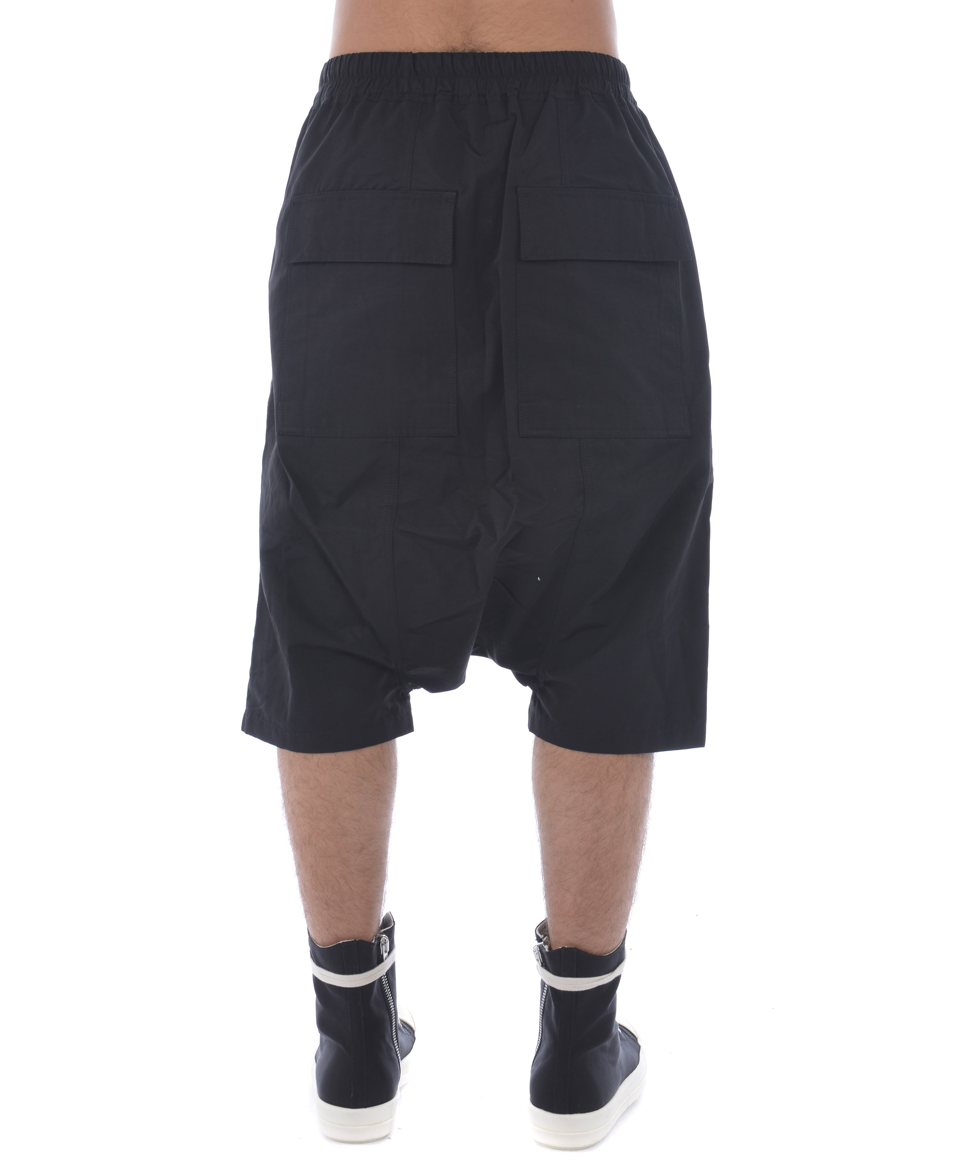 Bermuda Rick Owens DRKSHDW in tela di cotone Nero. Elastico in vita con coulisse. Tasche frontali a filo. Tasche posteriori a toppa con pattina. Cavallo Basso. Misura in foto S 52% cotone, 48% poliammide