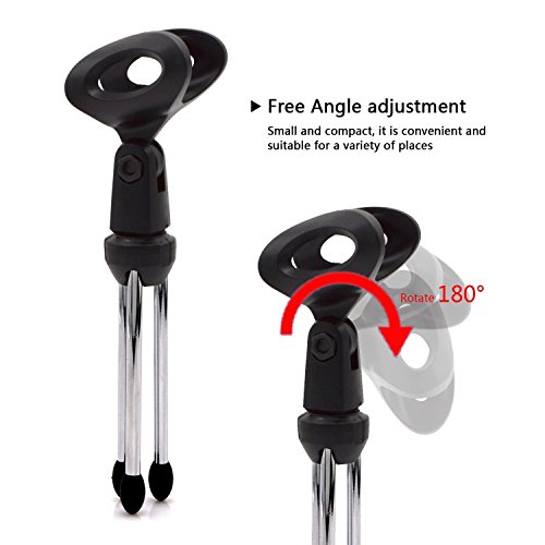 -. Feature : Material:Steel alloy tripod soft plastic holder,the stainless steel center strut is rustproof and uneasy to break or distort / The Mic clip is 180-degree adjustable, can be set to suitable angles as you need / Soft and flexible plastic clip holder securely grasps the microphone without any scrapes / Detachable design makes it more portable and easier to store / Universally compatible with almost all normal-sized handheld microphones