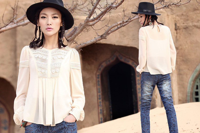 不能忘记如花的容颜,盛开在柔情似水的时光,在最美好的年华里遇见,一眼永恒,即使荏苒的光阴也不能磨灭。浪漫柔美的雪纺衫,简约大气圆领,衣襟精美镂空蕾丝拼接,肩、袖、前襟整齐的风琴褶,宽松的A字版型,有着少女一般清甜的气质,纯美如雏菊。
