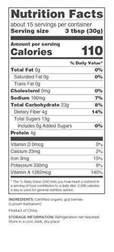 Goji berries are also a potent source of antioxidants - one serving contains 140% DRV of vitamin A. Enjoy goji berries as a healthy snack or add them to salads, oatmeal, granola, cookies, cereal and trail mix.