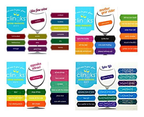 -. Feature : Clingks® are an edgy and fun alternative to wine charms. A great conversation starter to encourage mingling! / Add sass to your glass! Modern and Fun way to find your drink at a party. Find your drink by Color, Pattern, or Sassy saying / Leaves no residue - safe for all styles of drinkware. Made of Vinyl Static Cling. Cling to any non-porous surface: glass, aluminum, ceramic & plastic. / Reusable Designs - reuse from glass to glass and from one party to the next. Dimensions: 1/5 x 2-Inch - 12 Markers in a set. / Set includes Like Fine Wine, Another Year Older, Opposites Attract and Lake Life - 48 drink markers total. NOT Dishwasher Safe, NOT Microwave Safe. Made in USA