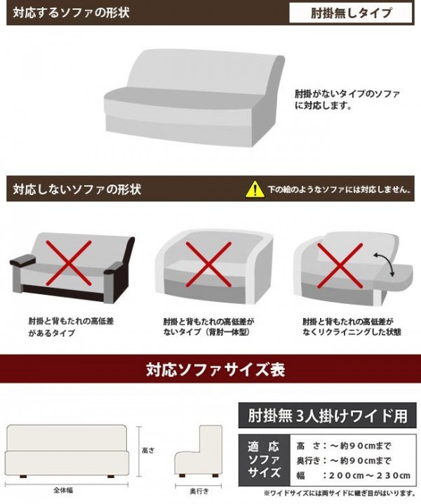 | 仕様 | 抗菌防臭加工(SEKマーク取得) ウォッシャブル(洗濯機洗い可能・ネット使用) 【適応ソファーサイズ】 高さ:~約90cmまで 奥行き:~約90cmまで 幅:200~230cm ※ワイドサイズには両サイドに継ぎ目が入ります。 |