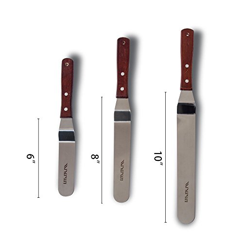 - Include the most common use size (6, 8, 10 inches) of angled icing spatula. They would absolutely do a great job no matter used for decorating a large cake or small cupcake.