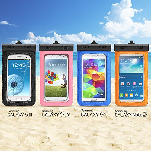 - Feature : [Not COMPATIBLE with Galaxy Note 4] Universal waterproof pouch design provides protection for keys, ID, credit cards, cash, MP3’s, phones, and more from water damage. / Composed of a highly-durable thermoplastic polyurethane (TPU) material, which protects against water, dust, dirt, grease, scratches and bumps. / Innovative swivel lock design provides a user friendly experience when opening or sealing the pouch. / Ultra Clear-film material allows full touch screen access and button control functionality as well as the ability to take photos while the pouch is still equipped. / Comprehensive protection allows use in mud, water, snow, dirt, and grease. Quality tested: Waterproof protection up to a depth of 4 meters.