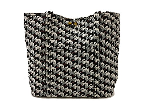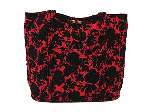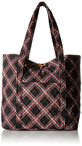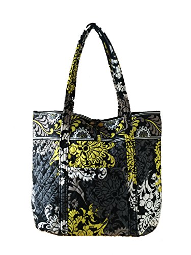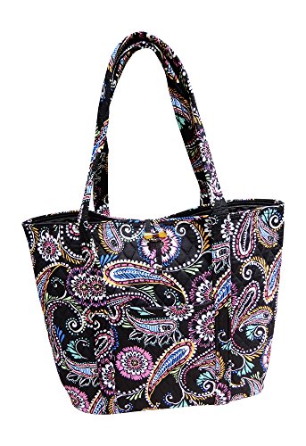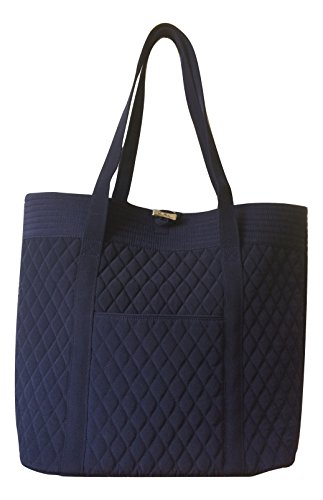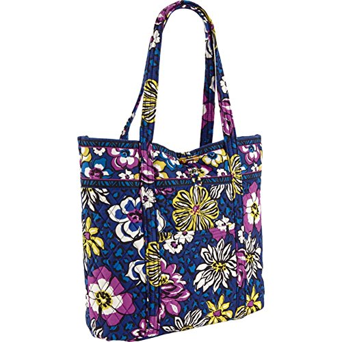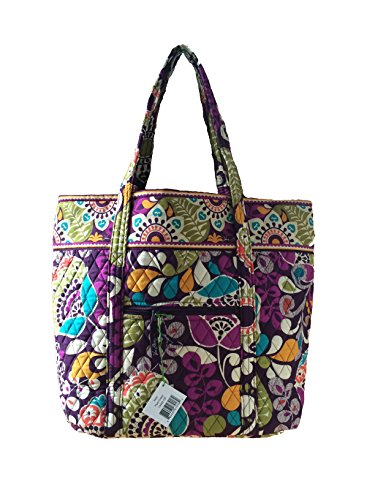 Vera's durable and spacious Vera tote is made of soft quilted fabric with a removable sturdy fabric covered bottom insert. The open top features a loop and tortoise toggle closure and the interior featuring 6 roomy open slip pockets. There is an open slip pocket on the front, and a zippered pocket on the back. The dual straps have a comfortable drop of about 11 inches and are sewn from the bottom, all the way up each side. The Vera Tote is versatile and makes for a great, every day tote - whether for school, work, the beach, or the gym. It makes a great carry-on bag for travel, or even a beach bag. It is lightweight, and easily maintained. Just remove the sturdy fabric covered insert and it can be placed in the wash. It measures 14 inches long at the bottom and tapers to 17 inches long at the top x 14 inches high x 6 inches wide. Machine wash cold, gentle cycle, only non-chlorine bleach as needed, line dry. Patterns with solid color interiors are designed for Vera Bradley Outlets.Feature