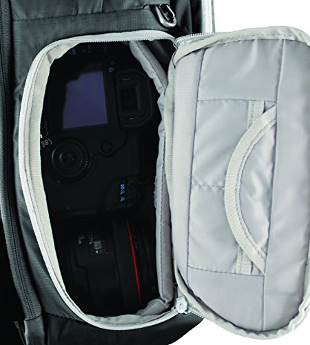 - Feature : Fits most DLSR cameras (e.g. up to Canon 5D) or mirror less compact system cameras with standard mounted lens and extra lens / Top zippered main compartment for your jacket or travel items, -drawstring inner divider opens to transform into 1 large 16L compartment / Rear secured zippered pocket fits a MacBook 13" or 3L hydration / Our eXomesh slash guard are built into (and concealed) in the most commonly vulnerable areas of bag, protecting your gear from a quick slash and run theft. / Zipper pullers can be attached to discreet security hooks or placed under and through a hypalon tab to prevent pickpockets reaching into your bag.