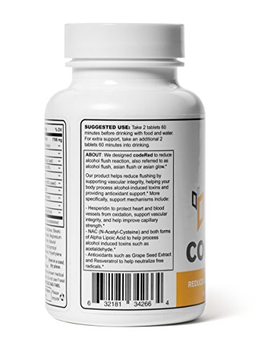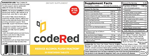 We designed code Red to reduce alcohol flush reaction, also referred to as alcohol flush, Asian flush or Asian glow. Our product helps reduce flushing by supporting vascular integrity, helping your body process alcohol-induced toxins and providing antioxidant support.