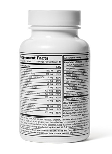NAC (N-Acetyl-Cysteine) and both forms of Alpha Lipoid Acid, which not only support healthy liver function, but are also essential in the body's production of glutathione, a key antioxidant that help process alcohol induced toxins such as acetaldehyde.