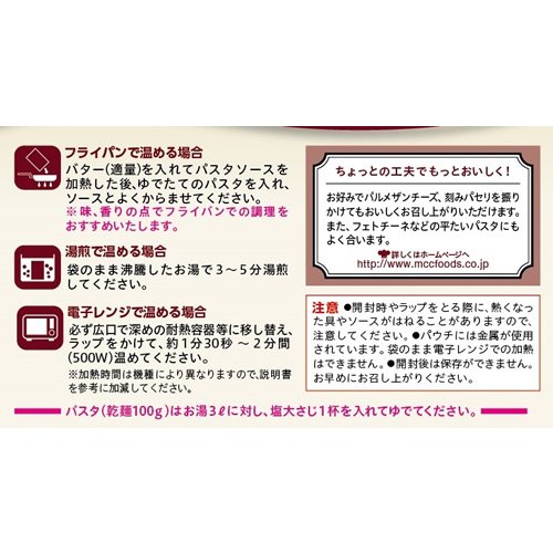 フライパンで温める場合 バター(適量)を入れてパスタソースを加熱した後、ゆでたてのパスタを入れ、ソースとよくからませて下さい。※味、香りの点でフライパンでの調理をおすすめいたします。 湯煎で温める場合 袋のまま沸騰したお湯で3~5分間湯煎して下さい。 電子レンジで温める場合 必ず広口で深めの耐熱容器に移し替え、ラップをかけて約1分30秒~2分間(500W)温めてください。 パスタ(乾麺100g)はお湯3lに対し、塩大さじ1杯を入れてゆでてください。