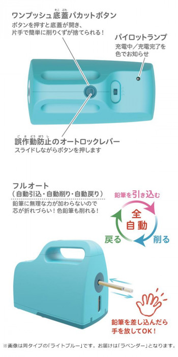 片手でワンプッシュ!!削りくずを直接ゴミ箱にパカッと捨てられる机を汚さない自動鉛筆削り器です。持ち運びに便利なグリップとコンセントが無くても使える充電式なので、リビングや子供部屋など、使用シーンを選びません。 |