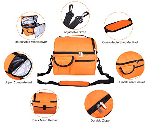 - DOUBLE DECKER DESIGN : Featuring two sections which allow you to store hot and cold foods separately. The wide opening allows for easy loading and unloading, and the premium zipper enables effortlessly smooth glide.