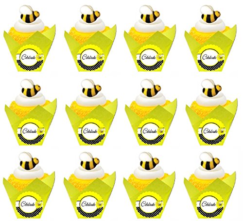 12pack Celebrate Edible BumbleBee Sugar Cupcake Decoration Topper with Decorative Baking Cup Liners -12ct