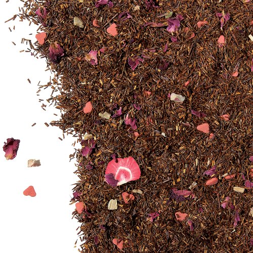 -. Feature : Tempting tea creation with red sugar hearts and scented rose blossoms / Caffeine free / Ingredients: All natural - rooibos tea, red sugar hearts (sugar, rice flour, hard peanut oil), rose blossoms, freeze-dried strawberry peels and rhubarb pieces / Infusion is copper-colored with chocolate-strawbery taste