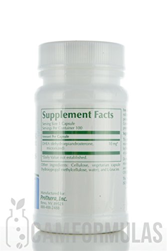 DHEA 10 mg 100 caps Dietary Supplement ProThera products may only be purchased by Health Care Professionals. Patients who want to buy ProThera products may obtain them from their Health Care Professional. This product contains pure DHEA that has been micronized to a very small particle size to facilitate absorption. Vegetarian capsules made of plant cellulose are used. Supplement Facts Serving Size 1 Capsule Servings Per Container 100 Amount Per Capsule DHEA (dehydroepiandrosterone 10 mg micronized) Other ingredients: Cellulose vegetarian capsule (hydroxypropyl methylcellulose water) and L-Leucine. Free of the following common allergens: milk/casein eggs fish shellfish tree nuts peanuts wheat/gluten corn yeast and soybeans. Contains no artificial colors flavors or preservatives. Suggested Use: 1 to 2 capsules daily with food. Do not use if full-bottle shrinkwrap is broken or missing. Store in a cool dry place (59 F-85 F) away from direct light. KEEP OUT OF REACH OF CHILDREN. This product was made in a GMP and ISO 9001:2008 registered facility.Feature