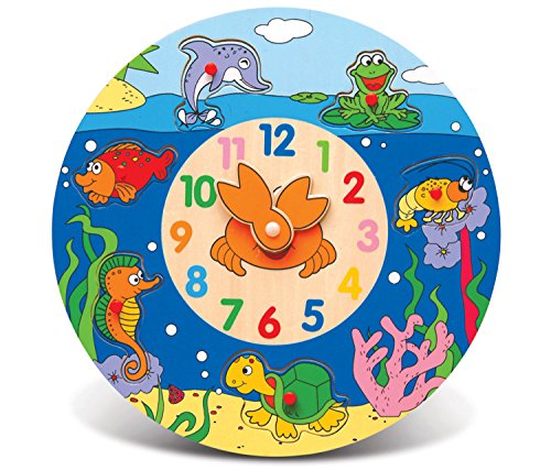 Colorful Natural Wood Raised Puzzles Clock "Ocean Life: Sea Animals" - Educational Toy For Children Age 3+. A fun and educational toy. Consists of 6 animal peg puzzles and a clock board - all made from natural wood. Measures 12" L x 12" W. Recommended children age 3+. Kid Safe: Conforms to USA safety standards. This is not a functional clock - there are no mechanical parts or battery.Feature
