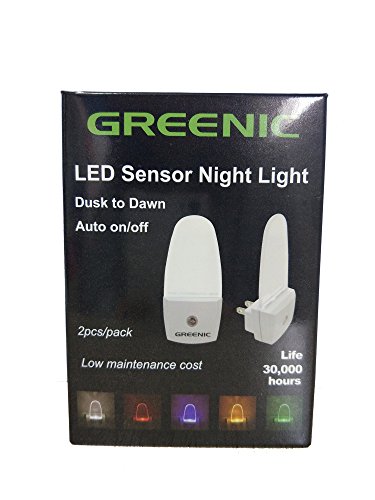 Greenic 0.5W Plug-in Dusk to Dawn Light Sensor Auto on/off LED Nightlight Wall Light 2-Pack White/Blue/Yellow/Amber/Red/Green Glow, features ultra slim&sleek modern design, non-polarized pin plug that can be plugged upside down, eco-friendly LED night light, energy-saving (only 0.5W). This night light turns on automatically when light fades out or room goes dark, or windowless bathroom when lights off, and turns off when light is back or the room is lit. It gives perfect amount of light for night trips to bathroom, so you don't stub your toe in the dark. It comes in 2 count, and available in white(6000K,bright enough for kitchen&hallway), green, blue, yellow/amber(2000K,soft glow without disturbing your sleep), and red glow.Feature