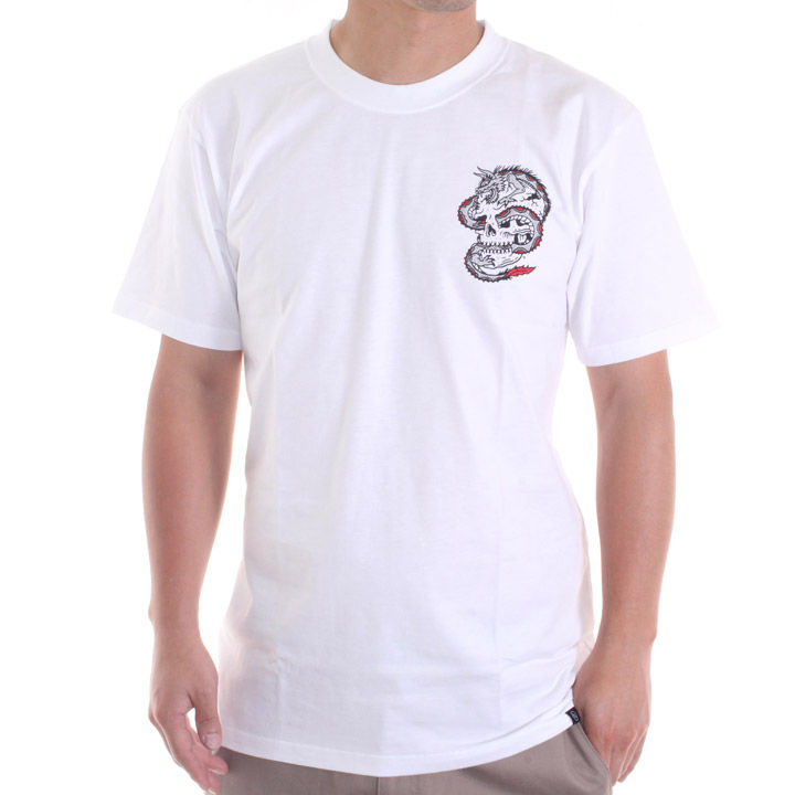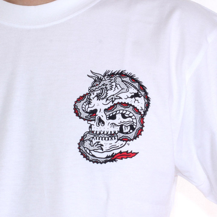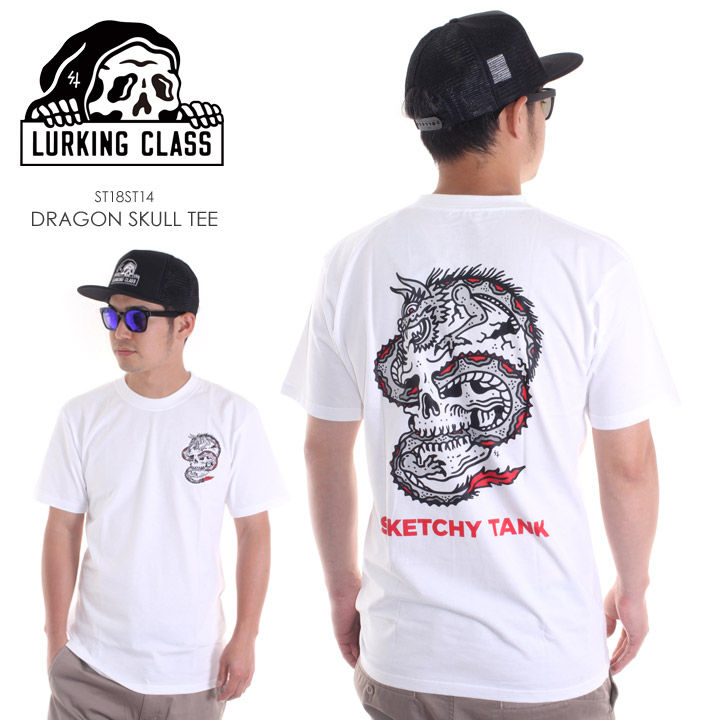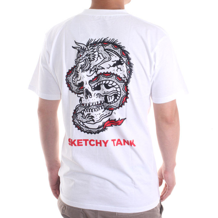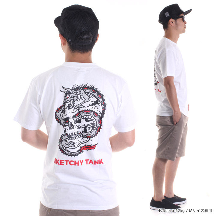 バックに描かれたストリートライクなイラストが目を惹くインパクト抜群のTシャツです。スカルとドラゴンのモノトーンに赤のアクセントが効き、より存在感を放ち、また裾の"SKETCHY TANK"ピスネームがポイント。一枚で漢らしくキマる今季イチオシの一枚◎