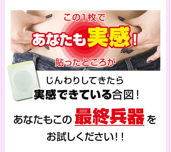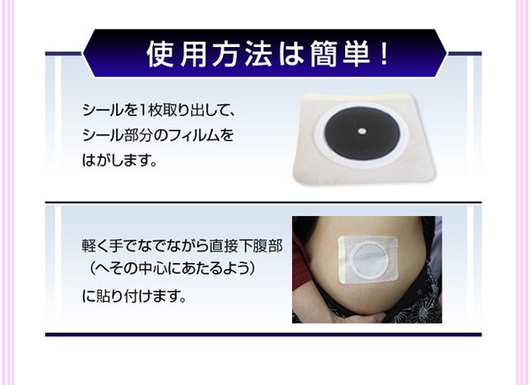 軽く手でなでながら直接下腹部(へその中心に磁石があたるよう)に貼り付けてください。本品を貼る際には、はがれないようしっかりと貼ってください。丸いフチ部分は、はがれやすいのでご注意ください。 |