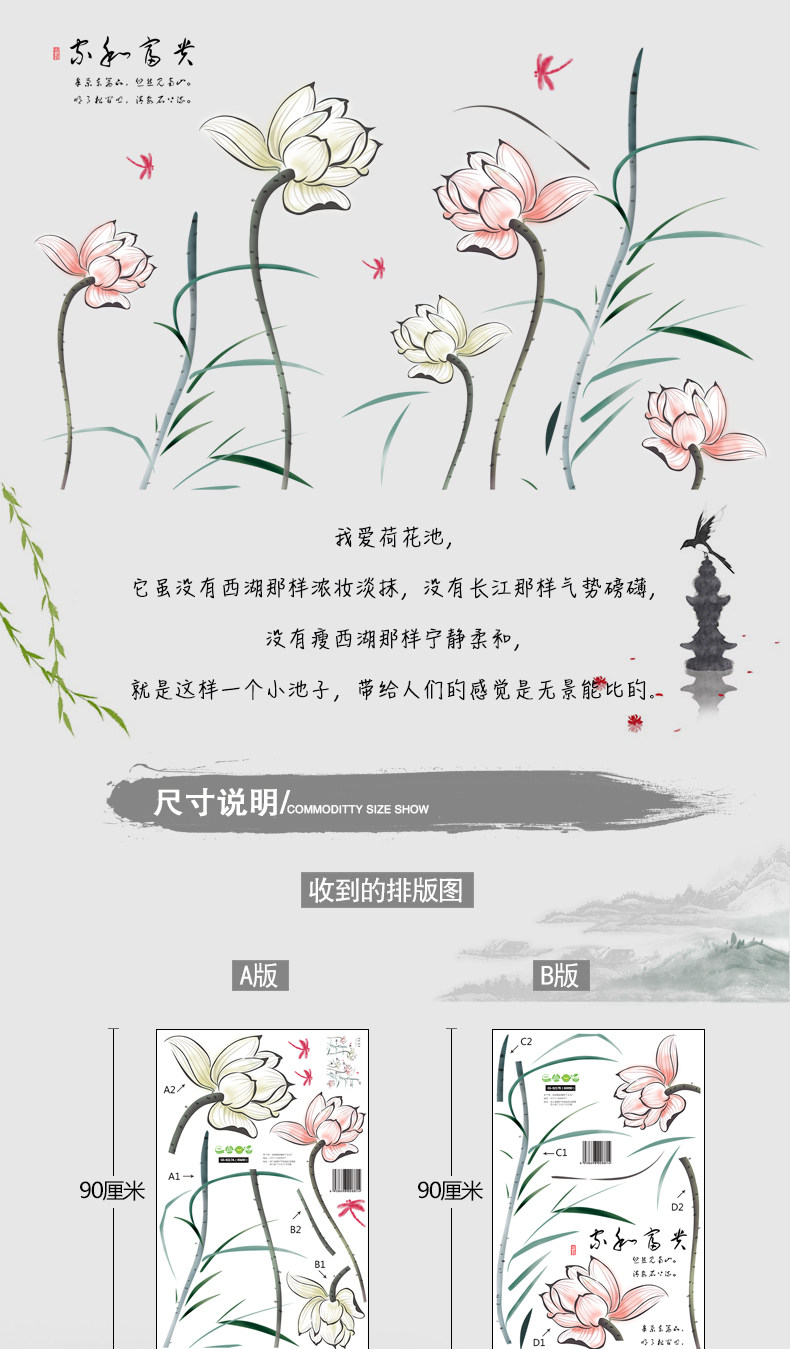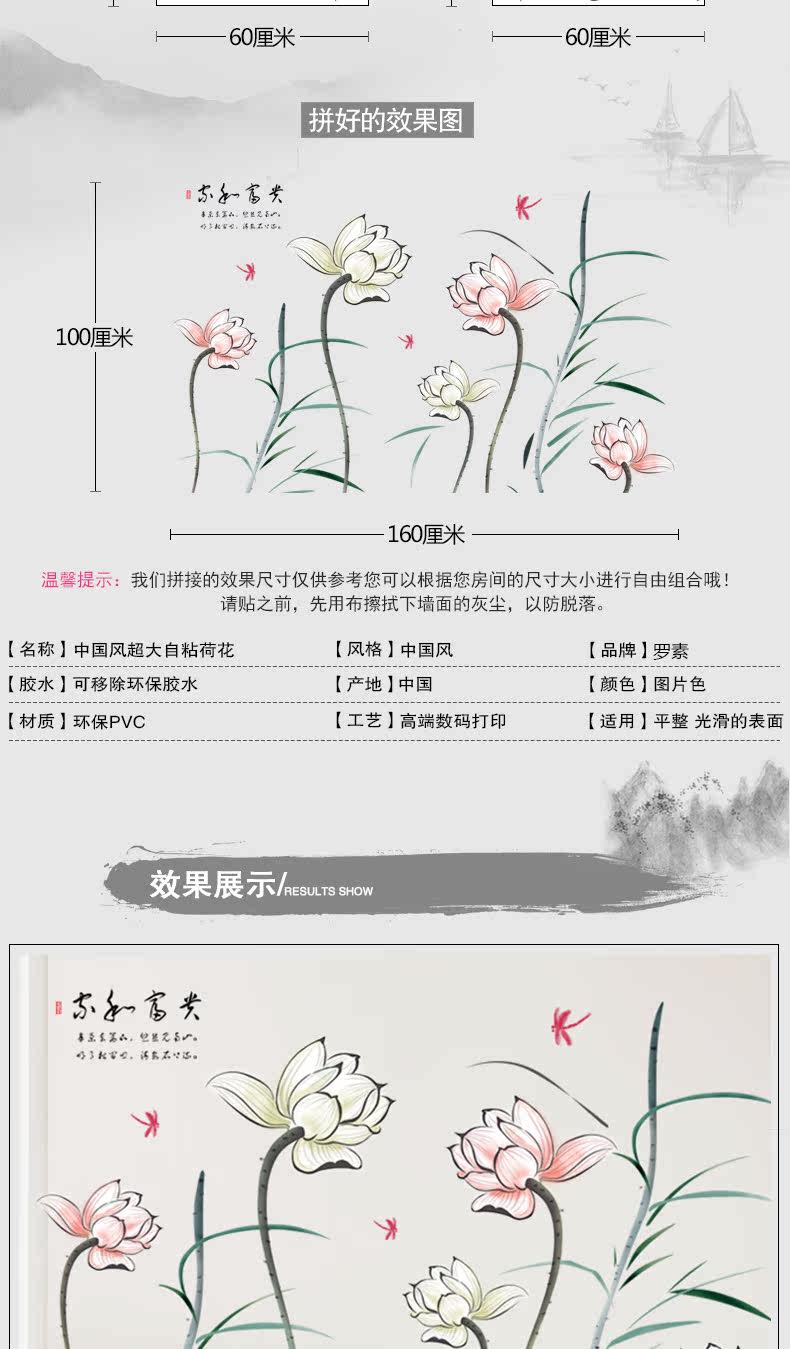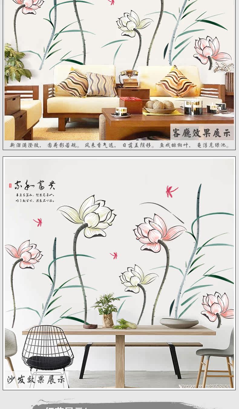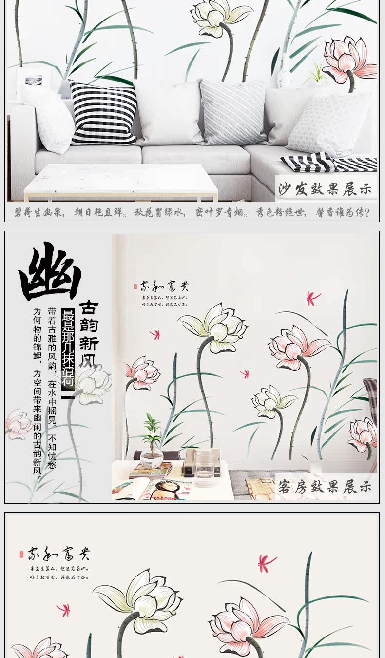 中式水草荷花墙纸自粘墙贴画客厅卧室房间温馨墙壁装饰品防水贴纸