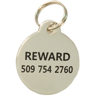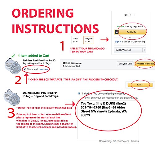 Product Description Premium Paw Print Stainless Steel Pet Id Tag. Includes 4 lines of info such as pet name, phone number, email, or address. Free shipping. Includes Split Ring Attachment. 0
