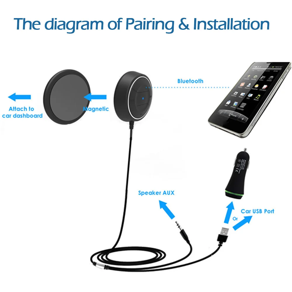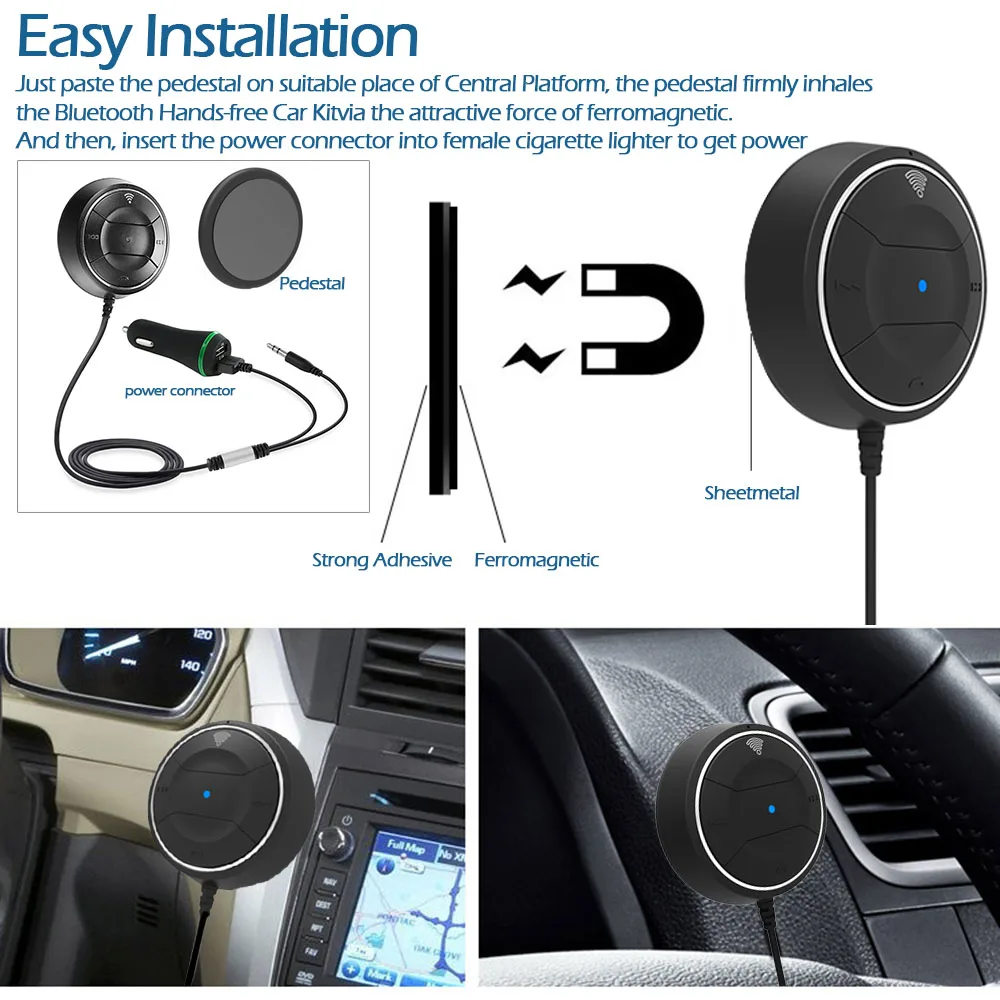The Bluetooth 4.0 Hands-free Car Kit is equipped with standard USB and 3.5mm Audio Cable, powered by Stand USB port, No batteries required. And its Magnetic base is more easily detachable from the flexible pedestal compared with sticky base.