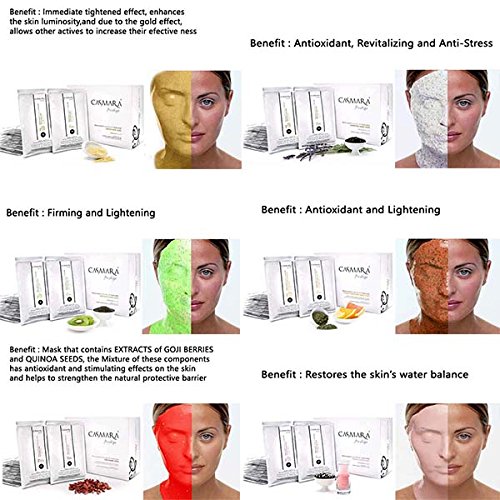 -. Feature : Each Facial Masks is consist of (1 x 100ml Gel and 1 X 25gr Powder) / GreenTea Mask 2050 - White Mask for all skin types, especially fatigued or damaged skins. Unisex formula for all ages, at any time of year. Benefits : Antioxidant, revitalizing and anti-stress. NOVAnew Mask 2045 - Pink Mask for all skin types, especially in case of dehydrated skin. Unisex formula for all ages, at any time of year. Benefits : Restores the skin's water balance. / Gold Mask 2080 - Gold This mask presents various exclusive properties: revitalising because of the 24 karat gold dust that it contains, mineralising because of the provision of magnesium, calcium and sodi Benefits : Immediate tightened effect, enhances the skin luminosity, and due to the gold effect, allows other actives to increase their effectiveness, R6tense Mask 2060 - Kiwi Firming mask for all skin types, especially skins showing signs of flaccidity. Unisex formula for all ages, at any time of year.. Benefits : Firming and lightening. / Goji Mask 2070 - Red Mask for all skin types, especially in case of dehydrated skin. Unisex formula for all ages, at any time of year. Benefits : Mask that contains EXTRACTS OF GOJI BERRIES and QUINOA SEEDS. The mixture of these components has antioxidant and stimulating effects on the skin and helps to strengthen the natural protective barrier. Vitamin Vegetable Mask 2030 - Orange Energizing mask for any skin type and age, especially indicated in combination with anti-wrinkle and clarifying treatments. Unisex formula, can be used any time of year. Benefits : Antioxidant and lightening.