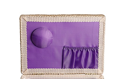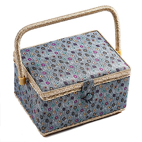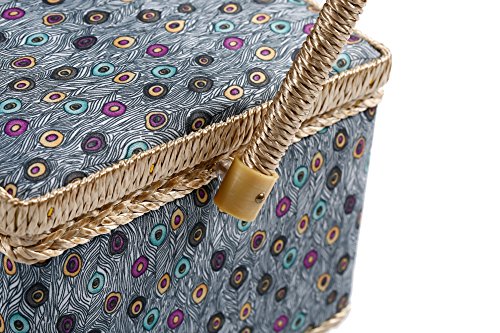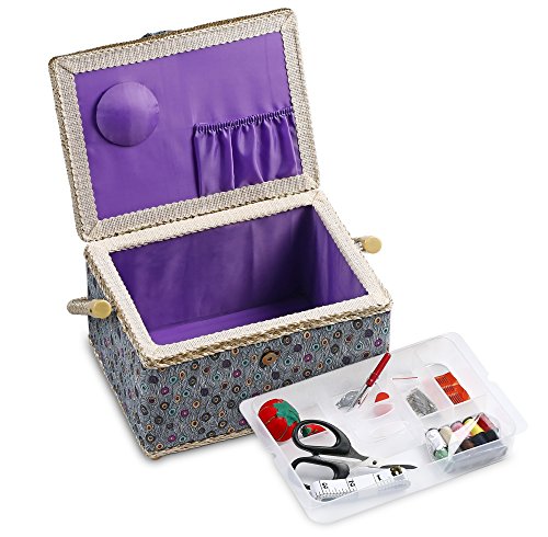 - Quality Craftsmanship - Sewing Basket is crafted from wood with a blue peacock cloth exterior and a plush lilac cloth interior. A durable internal plastic storage tray is included to organize all of your sewing supplies, as well as a pin-cushion and additional pocket.