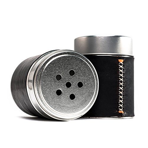 - A custom made can wrapped in hand-cut hand-stitched American Bison leather. Heck-fire, the style points alone of this lil’ dry rub shaker will magically improve the taste of whatever you’re cookin’.