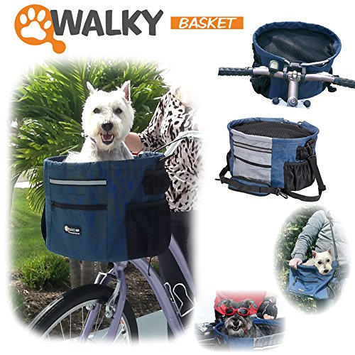 -. Binding : Misc. -. Brand : Walky Dog -. Color : Royal Blue -. Department : dogs -. EAN : 8019808112282 -. Feature : Designed for taking your pet with you on a bike ride, Easy Click quick release buckles / Includes Zippered storage pocket & Padded bottom, Reflective Strip, / Includes Mesh pocket for water bottle & Zippered mesh cover for top of carrier to zip pet in / Includes a short leash inside that can attach to your pets collar The leash is attached & Swen into bottom of Basket, Floor Board Can be removed for easy Cleaning and you will find Leash Stowed there in Inital packaging / We recommend professional installation of the mounting device by a bike shop. -. Label : Walky dog -. Manufacturer : Walky dog -. Model : WB -. MPN : WB -. NumberOfItems : 1 -. PackageQuantity : 1 -. PartNumber : WB -. ProductGroup : Pet Products -. ProductTypeName : PET_SUPPLIES -. Publisher : Walky dog -. Size : One size- up to 15lbs -. Studio : Walky dog -. Title : Walky Basket Pet Dog Bike Basket & Carrier Click release up to 15lbs