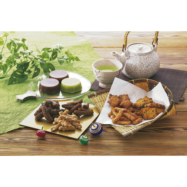 ●内容品:蜂蜜黒糖かりんとう45g、落花生かりんとう45g、あられ(海老)30g、あられ(海苔)30g、あられ(味噌)30g×各1