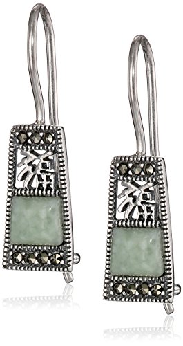 STERLING SILVER MARCASITE GREEN JADE FORTUNE WIRE DROP EARRINGS