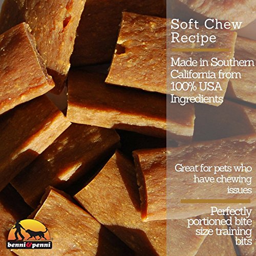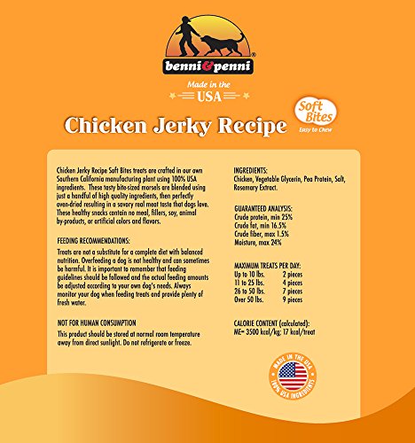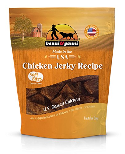 -. Binding : Misc. -. Brand : Benni and Penni -. EAN : 0884713000386 -. Feature : Proudly made with love and care in Southern California with 100% USA ingredients / Each piece is dehydrated up to 16 hours from USA raised chicken / Perfectly portioned in bite size training bits / Great for those pets who have chewing issues / Specialized soft chew formula -. Label : Hillside Farms -. Manufacturer : Hillside Farms -. PackageQuantity : 1 -. ProductGroup : Pet Products -. ProductTypeName : PET_SUPPLIES -. Publisher : Hillside Farms -. Studio : Hillside Farms -. Title : Benni & Penni USA 6 oz. Soft Bite Chicken Jerky -. UPC : 884713000386