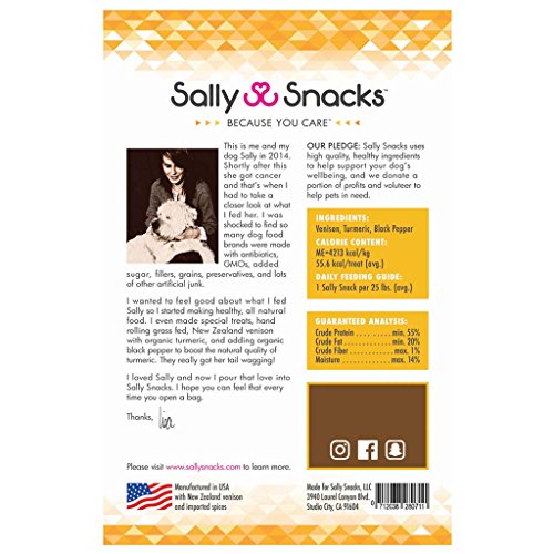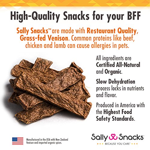-. Feature : LIMITED INGREDIENT DOG TREATS - BIGGER BAG! NEW & IMPROVED! Same Sally Snacks you/they love but better! JUST 3 PREMIUM INGREDIENTS: 5 Star Restaurant Grade, Grass-fed, New Zealand Venison, Organic Turmeric, and Organic Black Pepper. Watch your dog GO BONKERS! They deserve the best quality available - because you care! :) / HEALTHY SNACKS FOR DOGS - When it comes to dog food, so many dog treats and chews are loaded with junk! Sally Snacks contain NO GMOs, NO antibiotics, NO hormones, NO sugar, NO grains, NO fillers, NO animal byproducts, NO fake colorings, NO fake flavorings and NO preservatives! NO JUNK! / BENEFICIAL DOG FOOD - Based on the famous Golden Paste Recipe, 3 superfood ingredients were chosen to support dog health. Venison is a NOVEL protein MORE NUTRITIOUS THAN BEEF, containing more protein, vitamins, and minerals. Turmeric has been used as a POWERFUL ANTIOXIDANT/ANTI-INFLAMMATORY in herbal medicine for thousands of years. And remarkably, just a dash of black pepper BOOSTS THE ABSORPTION of those antioxidants exponentially. / DEHYDRATED DOG FOOD - It's no secret dehydrated food offers some benefits over cooked dog snacks because it preserves vitamins, minerals, and natural flavor without any added preservatives. THICK & CRUNCHY but easy to break into pieces for smaller dogs. Sally Snacks stay fresh up to 18 months when stored properly! Good luck keeping them from your BFF (Best Furry Friend) for long. Lucky dog! / THE PERFECT DOG LOVER GIFTS - No need to share! Buy a bag of #doggie crack for a fellow #SNACKHEAD ! Natural dog treats, made in USA, only using human-grade ingredients. Sally Snacks are a pawsome treat for finicky eaters and training (ahem, bribing) because dogs GO BONKERS for Sally Snacks!