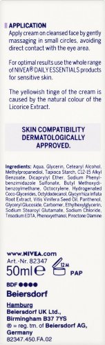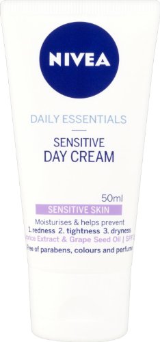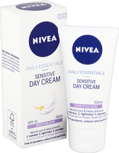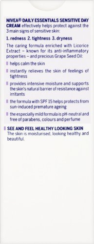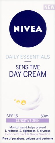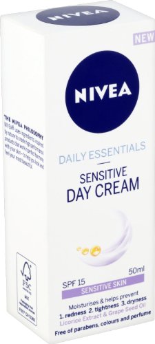 -. Binding : Health and Beauty -. Brand : Nivea -. EAN : 0721864926335 -. Feature : Please be aware that unless expressly indicated otherwise, Cooking Marvellous are not the the manufacturer of this product. Product packaging may vary from what is shown on this listing. We recommend that you do not rely solely on the information presented on our listing. Please always read the labels, warning and directions provided before using or consuming the product. -. IsAdultProduct : 0 -. Label : Grocery -. Manufacturer : Grocery -. Model : 82347 -. MPN : 82347 -. PackageQuantity : 1 -. PartNumber : 82347 -. ProductGroup : Beauty -. ProductTypeName : BEAUTY -. Publisher : Grocery -. Studio : Grocery -. Title : Nivea Daily Essentials Sensitive Day Cream SPF 15 (50ml) -. UPC : 721864926335