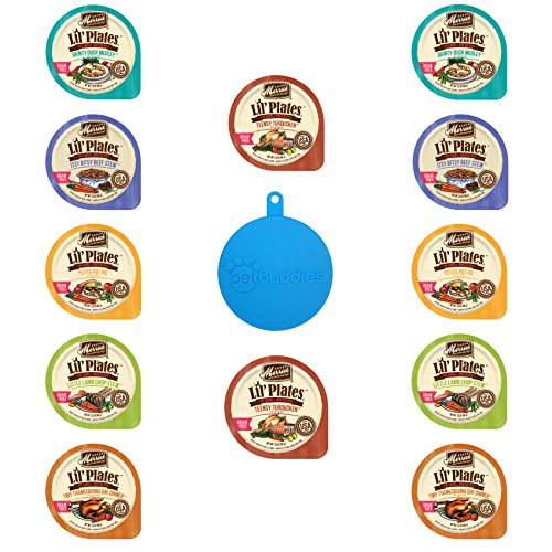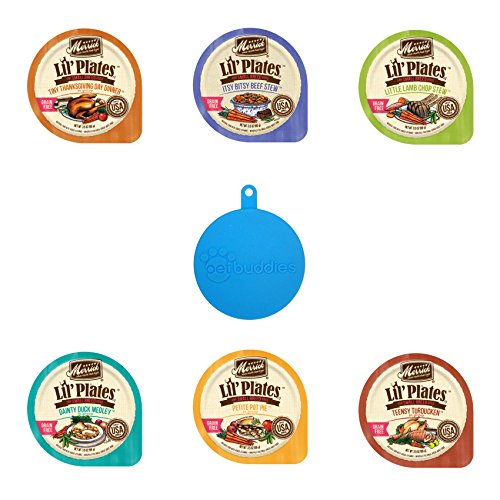 -. Feature : Includes 6 flavors of Merrick Lil' Plates Small Breed Grain Free Wet Dog Food Stews: (2) Dainty Duck Medley, (2) Teensy Turducken, (2) Little Lamb Chop Stew, (2) Tiny Thanksgiving Day Dinner, (2) Itsy Bitsy Beef Stew, and (2) Petite Pot Pie (12 Cups Total, 3.5 Ounces Each) / Includes 1 Pet Buddies Cat/Dog Food Silicone Can Cover in green or blue to keep your pet food fresh while containing unwanted odors; has 3 built-in rings to fit all 3 popular sizes of canned pet food; BPA Free / No. 1 ingredient is real deboned beef, duck, chicken, lamb or turkey / No corn, wheat, soy, or artificial ingredients / Made in USA