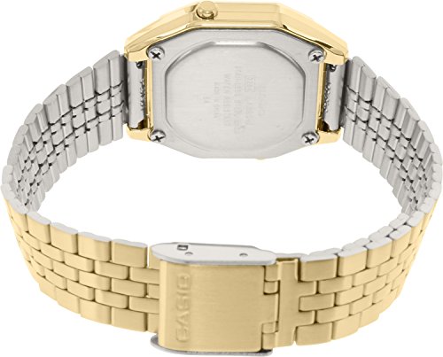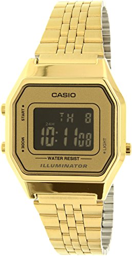 Brand, Seller, or Collection Name:Casio Model number:LA-680WGA-9B Part Number:LA-680WGA-9B Model Year:2016 Item Shape:rectangle Dial window material type:Mineral Display Type:Digital Clasp:Hook Buckle Case material:Stainless steel Case diameter:28 millimeters Case Thickness:8 millimeters Band Material:Stainless steel Band length:Women's Standard Band width:12 millimeters Band Color:Gold Dial color:Gold Bezel material:Stainless steel Calendar:Date and month Special features:Light Movement:Quartz Water resistant depth:30 Meters