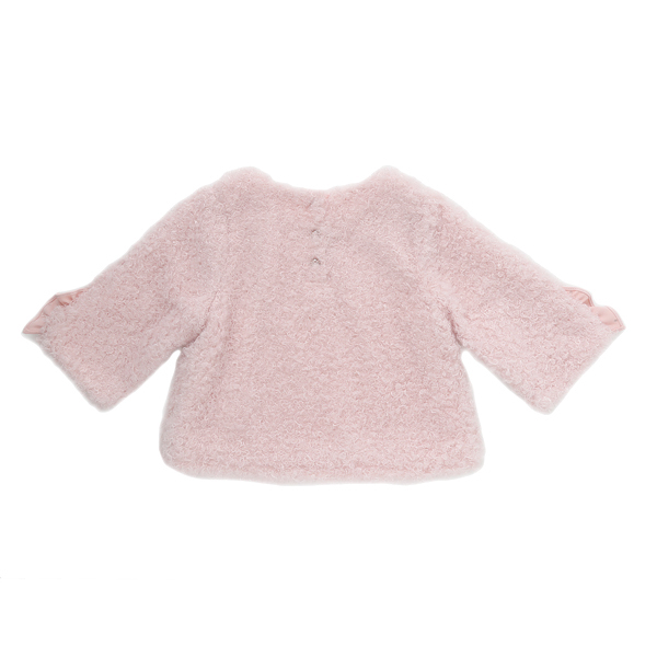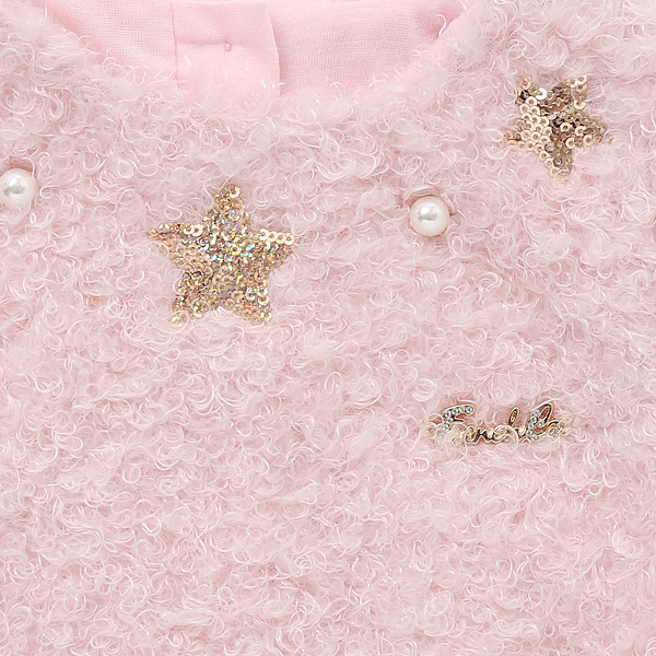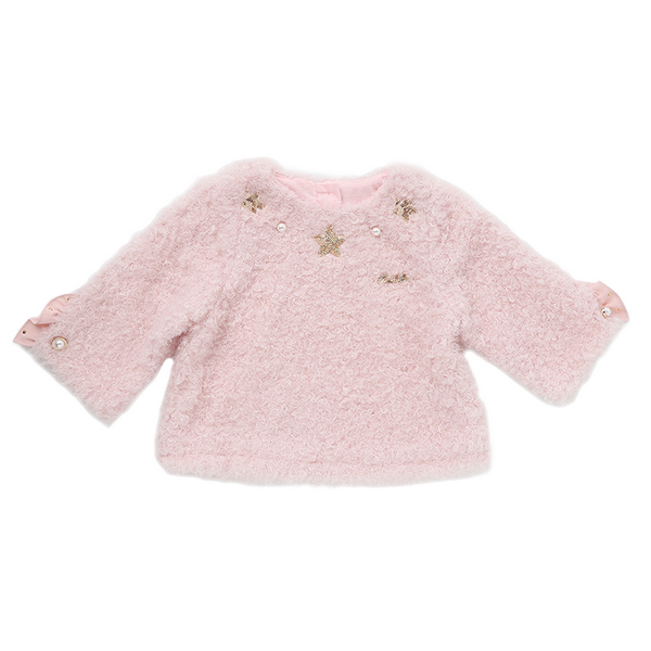 상품설명 핑크 뽀글이 탑입니다. 네크라인을 따라 들어간 스팽글 별자수와 진주장식이 착장시 아이얼굴을 더욱 환하게 해줍니다. 소매밑단의 프릴 디테일이 귀여운 디자인입니다.